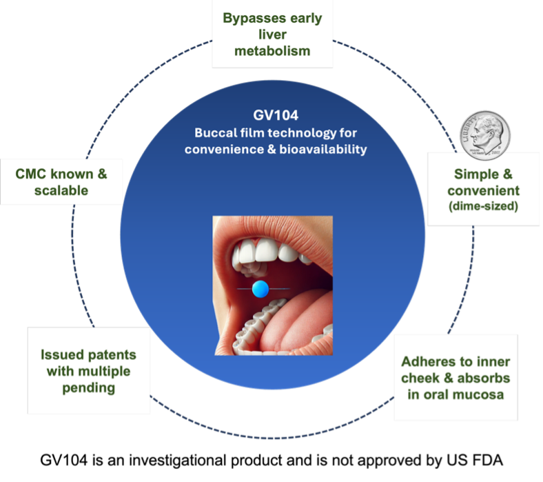GV104 represents a novel advancement in pharmaceutical innovation, serving as a cornerstone for our lead clinical program. This product is meticulously crafted by embedding a drug onto a proprietary transmucosal buccal film, designed to adhere seamlessly to the inner lining of the mouth. This unique formulation of GV104 positions it as an optimal candidate for addressing a spectrum of conditions, with our lead program addressing a critical need to protect military personnel and chemical incident responders.
